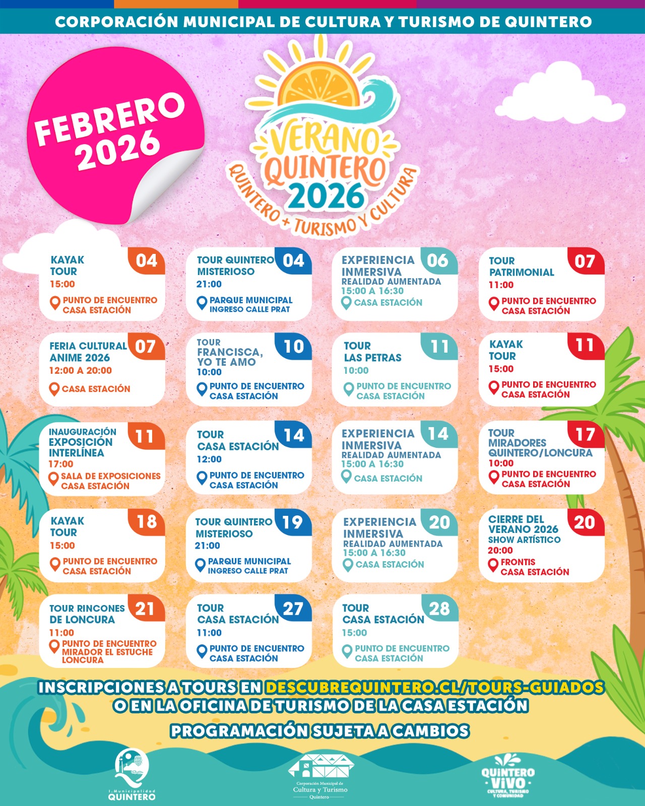 La Corporación Municipal de Cultura y Turismo de Quintero invita a vecinos, vecinas y visitantes a disfrutar de una variada programación de actividades culturales, turísticas y recreativas durante el mes de febrero, en el marco de Verano Quintero 2026.